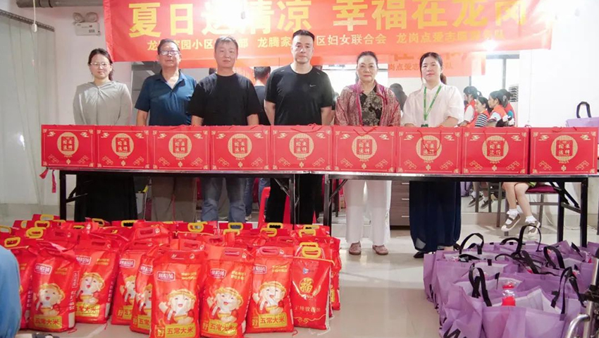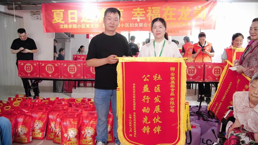 7 月 29 日,一场充满爱与关怀的 “夏日送清凉 幸福在龙岗” 公益活动在龙腾文化中心温情上演。在瑶海区委社会工作部的指导下,史城社区党委联合龙腾家园小区党支部、小区妇女联合会、龙岗点爱志愿服务队等共同举办了此次公益活动。安徽属梨食品有限公司积极参与其中,为社区的困难家庭老人、默默坚守岗位的保安和保洁人员送去了夏日里的丝丝清凉与深切关怀。