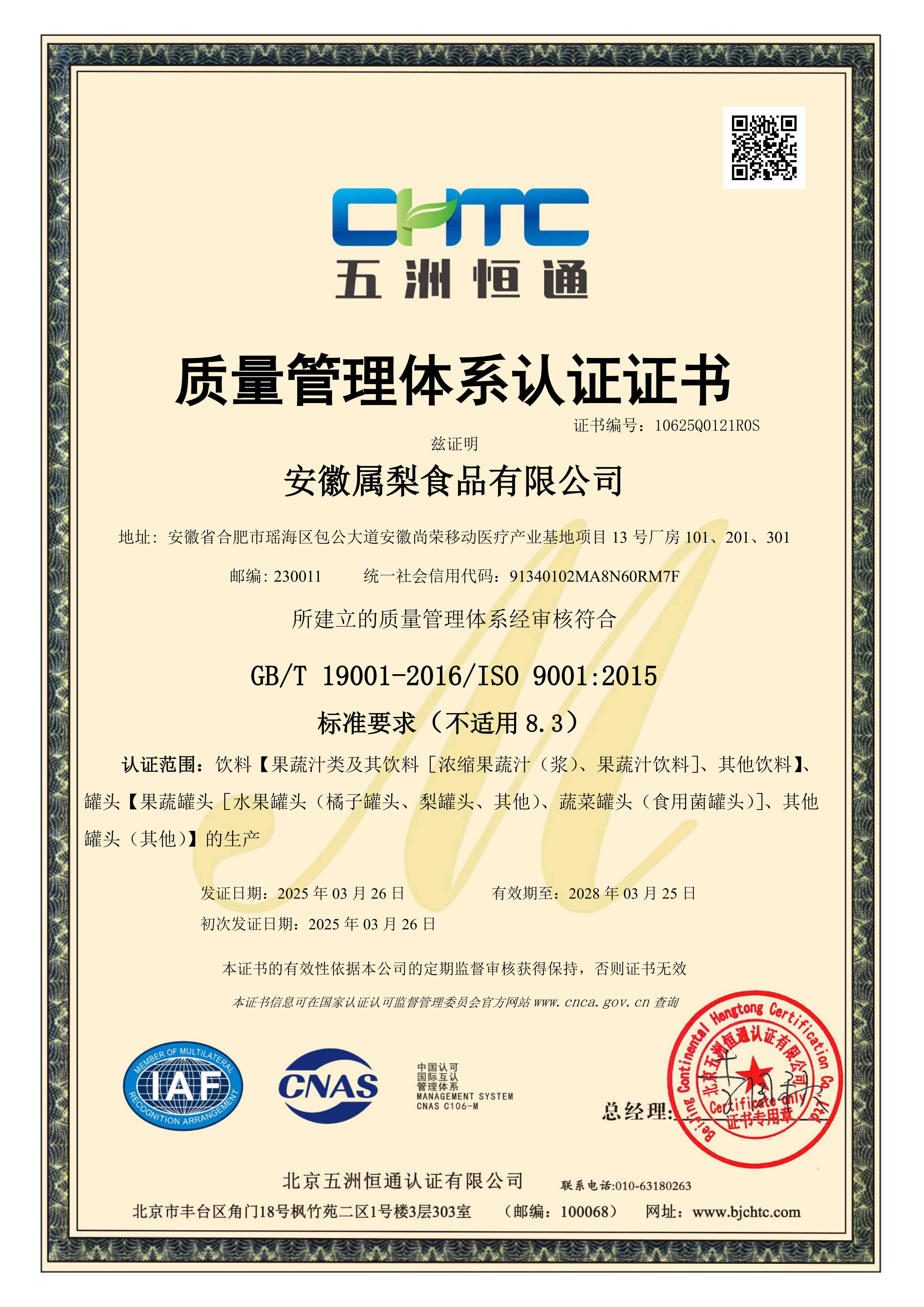 质量管理体系认证证书